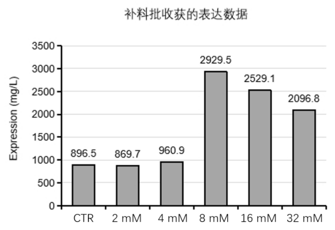 此前,并无高效表达人类神经生长因子(human never growth factor,hNGF)的培养方法,极大限制了 hNGF 的大规模生产和在临床与药物方面的应用。汉腾生物采用补料分批培养方法,并发现了新的添加剂,可以将 hNGF 重组蛋白的表达量提高至少 100%,产量最高可提升至 2900 mg/L左右(图 2),较大地提升了 hNGF 在 CHO 细胞中的表达水平(详细内容参考汉腾专利:重组神经生长因子的高效表达方法,CN2023108028220)。