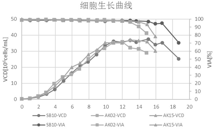 图 3. 活细胞密度(VCD)和细胞活率(VIA)。SB-10:环轨摇晃式生物反应器;AK02:3 L搅拌式生物反应器;AK15:15 L搅拌式生物反应器