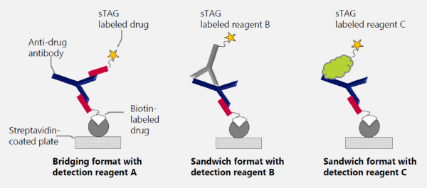 FyoniBio基于Meso Scale Discovery (MSD) 的电化学发光(ECL)平台检测临床样品中的ADA。并分别对桥式和双抗夹心ELISA形式进行检测评估。在酸解预处理后,使用生物素化的ASO药物作为捕获试剂,然后将待检样本加到链霉亲和素涂布的平板上,钌离子(sTAG)标记的ASO药物或检测试剂A、B和C用于检测(图2)。